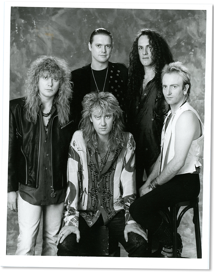 1992 Black and white promotional photo featuring Joe Elliott, Phil Collen, Rick Savage, Vivian Campbell, and Rick Allen. From the collection of Def Leppard.