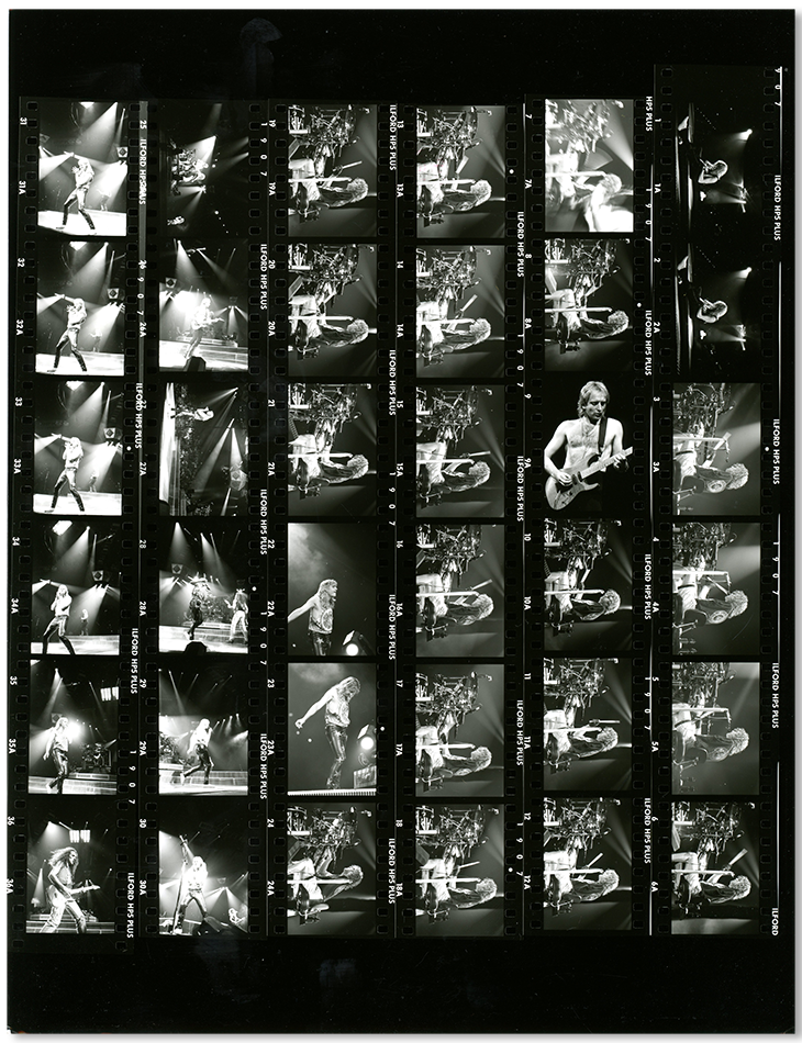 Black and white contact sheet of thirty six images of mostly Joe Elliott, Rick Allen, Rick Savage, Phil Collen, and Vivian Campbell rocking out on stage. The action shots were captured in 1992. From the collection of Def Leppard.