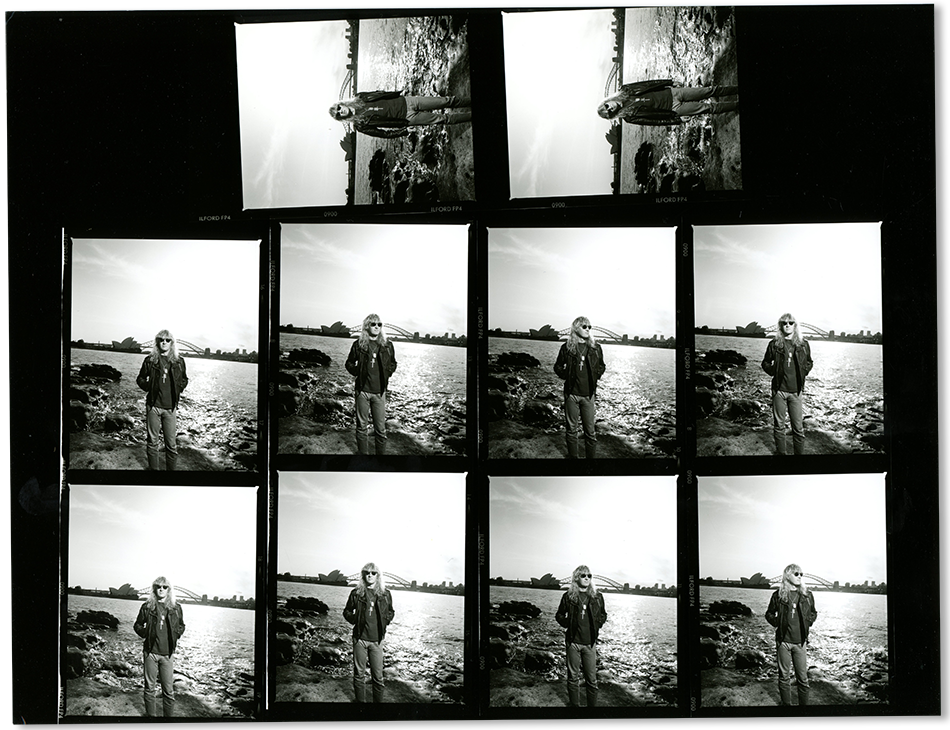 Black and white contact sheet of ten images of Joe Elliott along the shore with the Sydney Opera House in the background. These images were taken in 1992. From the collection of Def Leppard.