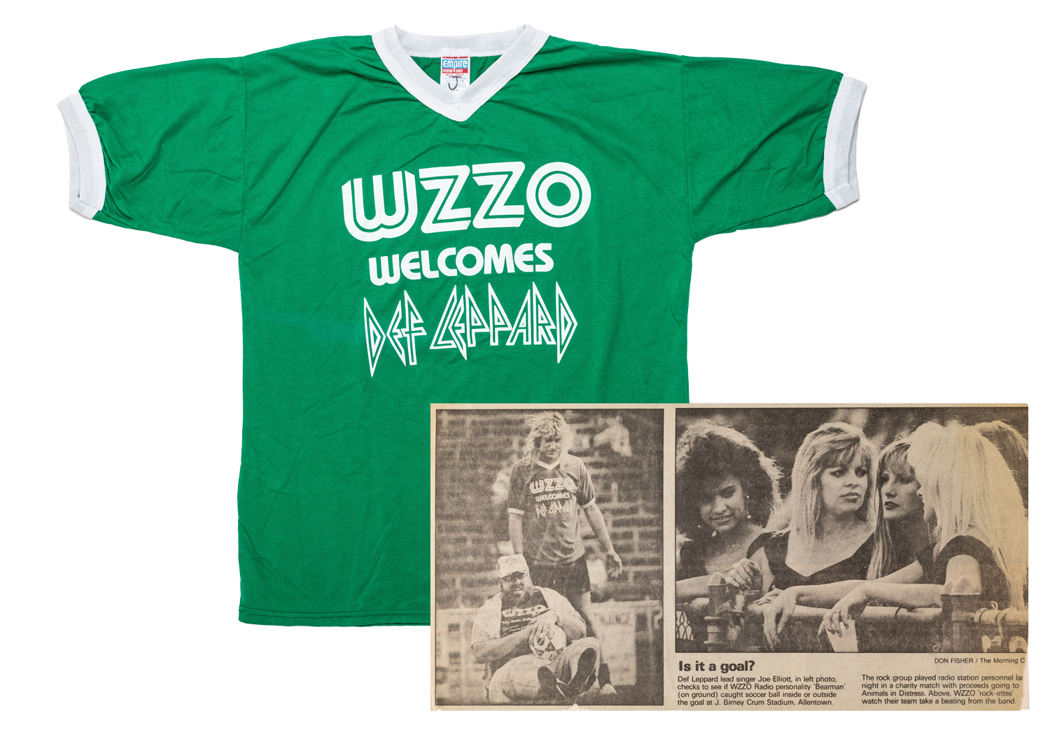 Joe's personal green WZZO Welcomes Def Leppard jersey. The inside tag is marked with a "J". Def Leppard played a charity soccer match against radio station WZZO's "Killer Z" team at the J. Birney Crum stadium in Allentown, Pennsylvania, 1983. The band won 3-2, with all three goals by Joe. From the Collection of Joe Elliott.