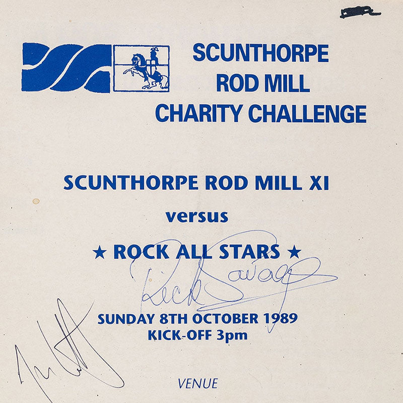 Program from the Scunthorpe Rod Mill Charity Challenge Rock All Stars soccer match signed by Joe, Sav, and Steve Harris of Iron Maiden, 8 October 1989, with accompanying newspaper clipping about the event. Joe and Sav played alongside Harris and Led Zeppelin's Robert Plant. From the Collection of Joe Elliott.