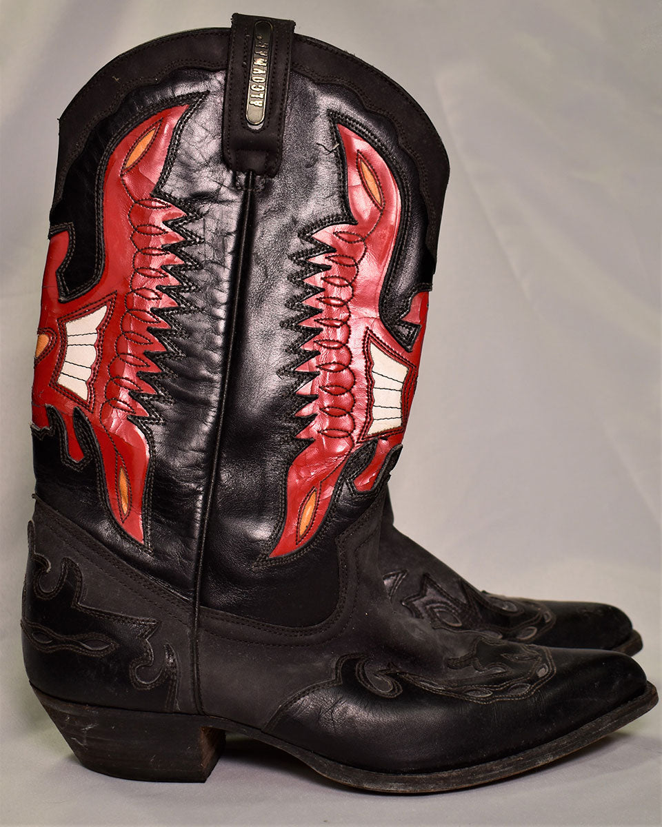 Rising from the depths of the Vault are these black leather Alcoymar cowboy boots with large red and white phoenixes hand-stitched on the front and back. The Alcoymar brand plate is sewn into the pull tabs. Worn 1987. From the Joe Elliott collection.