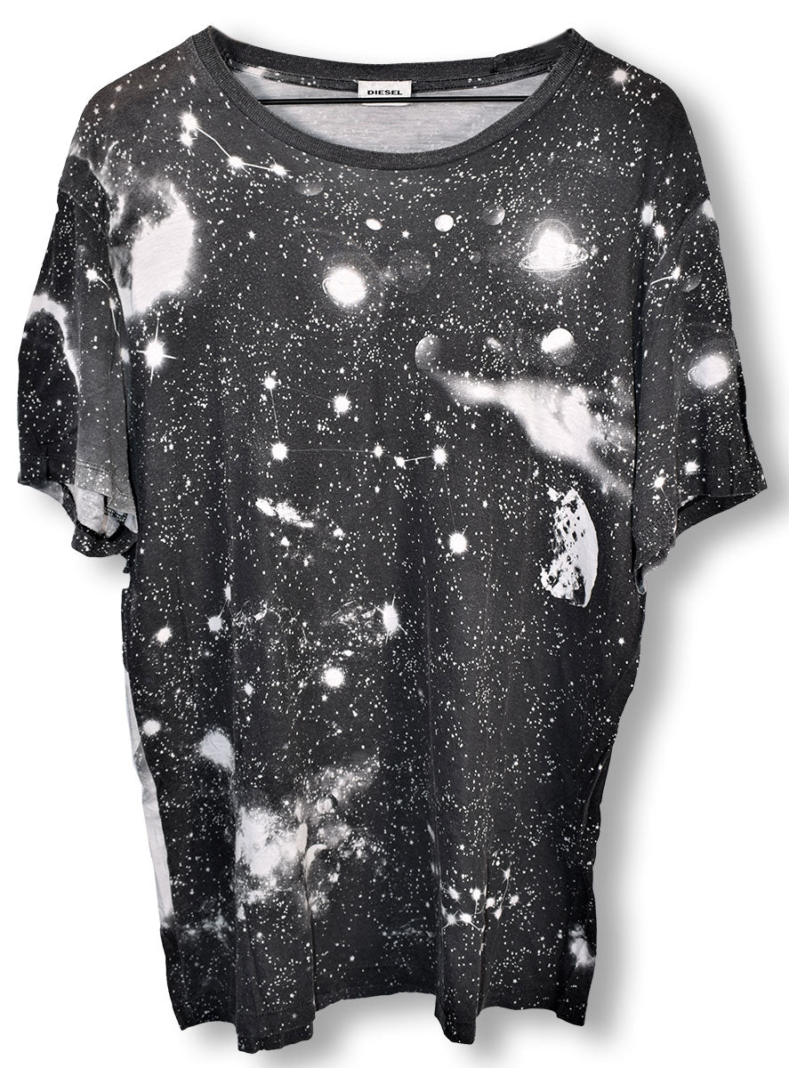 Joe Elliott's dark grey Diesel brand tee, with black and white constellation design on front and back. Worn in 2012/13. From the collection of Joe Elliott.