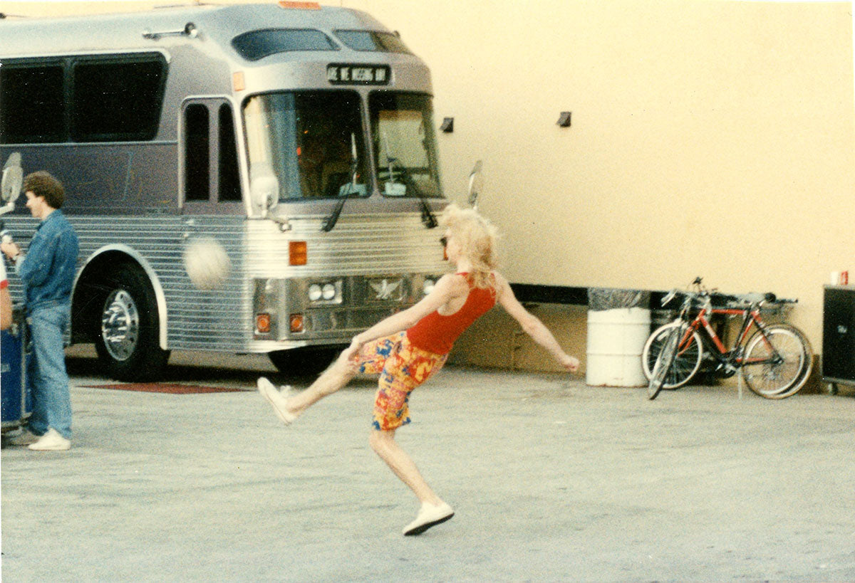 Steve Clark plays a little football behind a venue, waiting for the crew to finish setting up. Kicking a ball around was a common occurrence with the Leppards during the times in between arrival, set up, and sound check. Note the tour bus in the background which appears to read "Are We Meeting Up?" Another Leppard tour bus around the same period simply read, "Where's the Gig?" Courtesy of the Lorelei Shellist Private Collection.