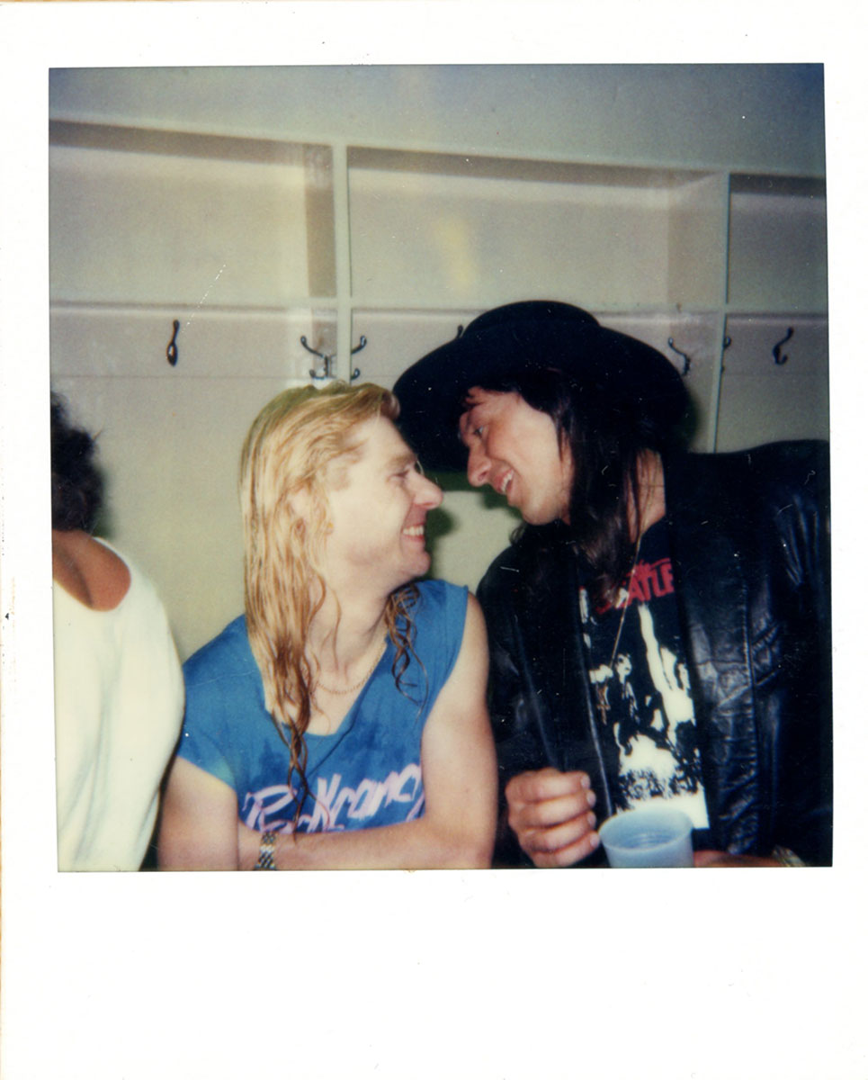 Steve Clark shares a laugh backstage with Bon Jovi's Richie Sambora at the Pacific Coliseum in Vancouver Canada, Hysteria Tour, 23 June, 1988. This was the final night of the Canadian leg of the tour, and to polish it off, Jon Bon Jovi performed as the special guest for the band's encore song "Travelin' Band." This color photo print captures a happy meeting between two of rock's great lead guitarists. Courtesy of the Lorelei Shellist Private Collection.