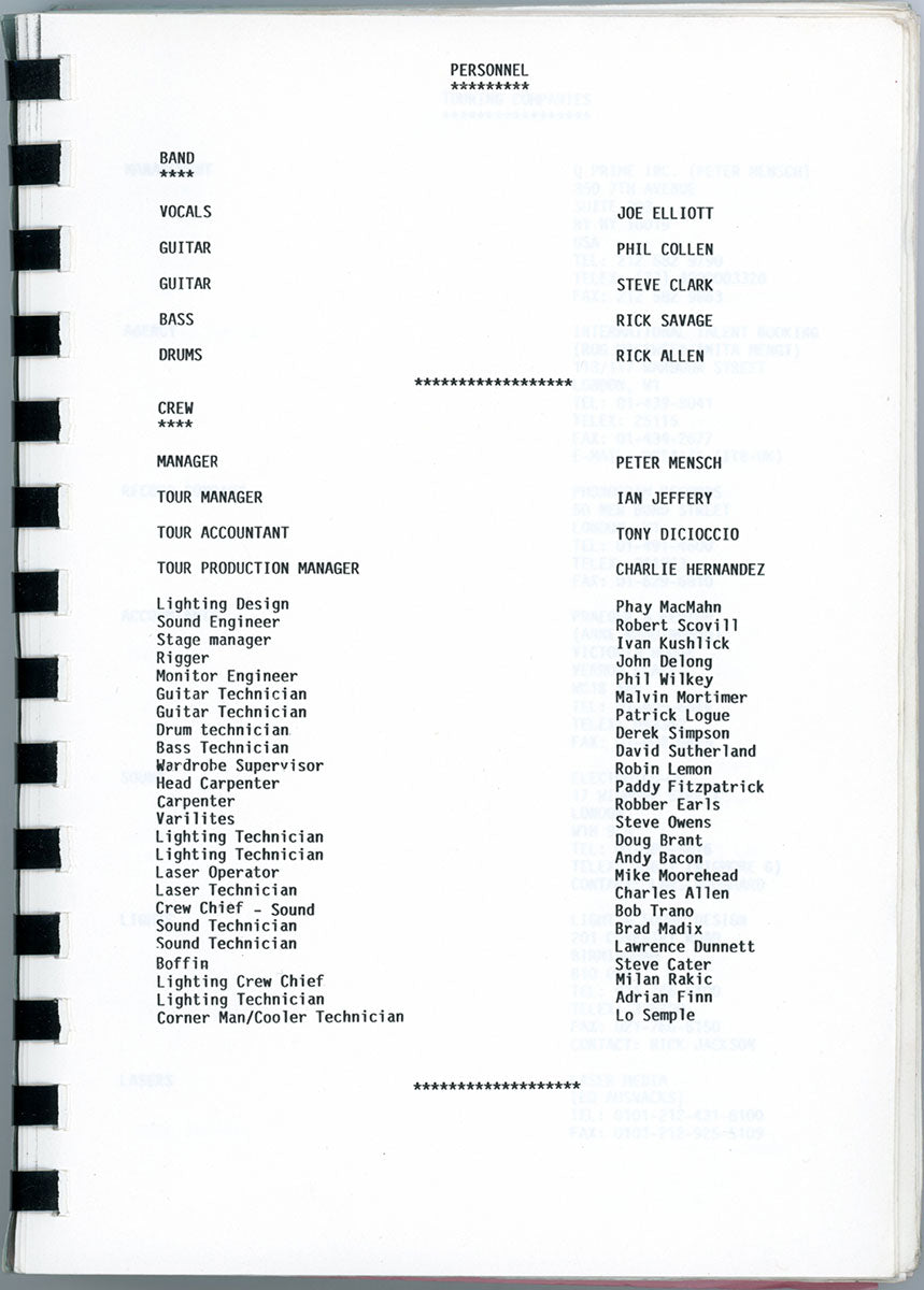 Steve Clark's personal copy of the Hysteria World Tour Itinerary Book for the US/Canada leg, 1988. This spiral bound itinerary includes tour dates/locations, personnel roster, and a triumphant congratulatory letter from one known as "Fearless Leader." Steve undoubtedly thumbed through these pages time and again, looking over the stops that had been, and the stops yet to come. Reading the itinerary gives a peek at the inner-workings of this wild, in-the-round, nowhere-to-go-but-under-the-stage mega-tour that was Hysteria. Can you feel it? Do you believe it? Courtesy of the Lorelei Shellist Private Collection.