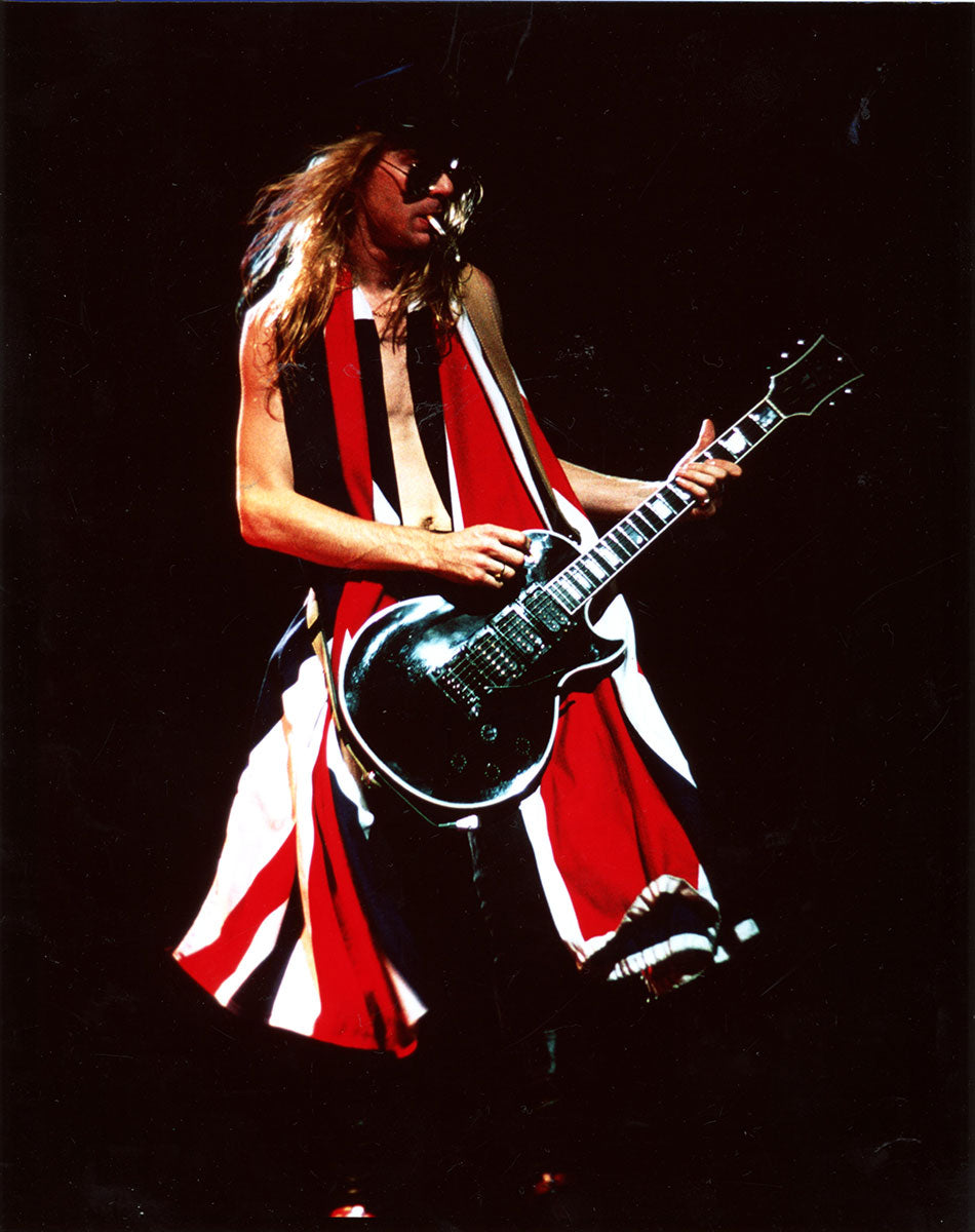 Encore! Encore! Steve Clark favored an end-of-show costume change to something a bit more wild, and the fans absolutely fed on it. In this live shot from the Hysteria Tour San Francisco in November of 1987 Steve plays his Back Beauty Gibson Guitar, and sports the Union Jack proudly draped over his shoulders, with black aviator sunglasses. Courtesy of the Lorelei Shellist Private Collection.