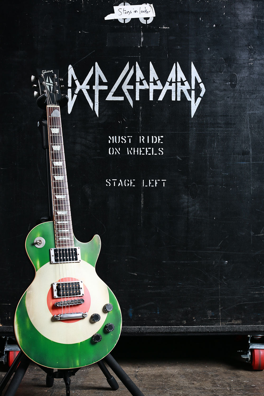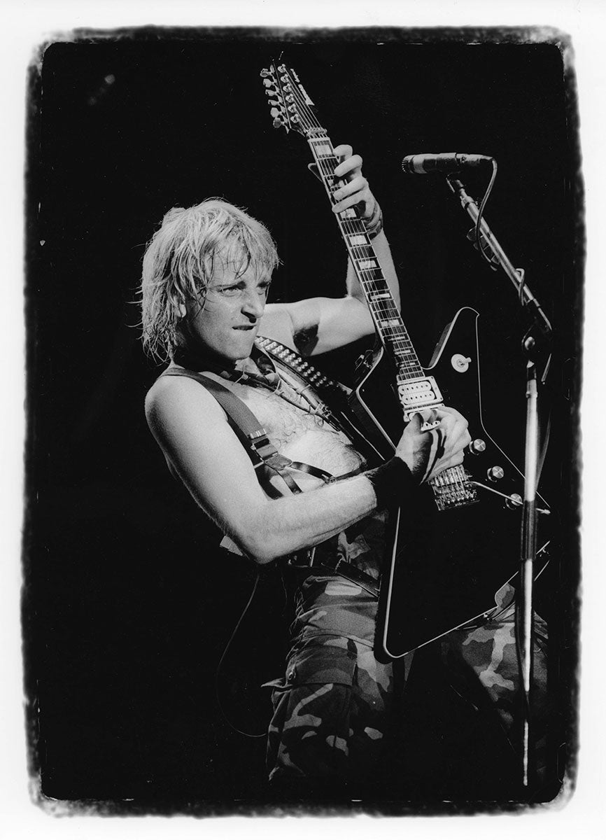 Bunny-slippered Phil Collen sits atop a guitar case playing his beloved 1978 Fender Stratocaster "Felix." He's in the Booterstown Band House in Dublin where Def Leppard began work on Hysteria in 1984. Felix helped define the sound of Hysteria, and Phil used it on more records than any other guitar he owns. He describes Felix as "kind of a road warrior... It would stay in tune, it reacted, it would respond. You'd turn it down it would go clean. It would just have these amazing different tones in it and others thing. So that was the thing. It was just very versatile as well." Here's more from Phil on his relationship with this very special guitar: "Well, it had a kind of a sound that you could do everything on. You know, all the Hysteria stuff like - it just had a clean Fender Strat sound. You could get it to sound like Jimi Hendrix. Or because it had a humbucker, you know, you could do all the other stuff, like you know ... Animal, you know, ... It was a really even guitar. And the intonation. That's such an important thing, you know? Especially when you're recording with Mutt. Mutt Lange. He's always saying, you know, we're going to do overdubs, so everything has to be in tune. Otherwise it just starts to get really wonky and, and, tuning wise ... So this guitar was - the intonation was perfect on it. And it's kind of rare that a guitar does that. Just kind of the whole all-around thing. I actually used it recently. It was in Joe's demos and stuff, and I, and I used it and sounds really cool. Still... Well, I have to drop a name here. So I met Eddie Van Halen, when I was rehearsing with Girl. And uh, I was playing this and Ritchie Blackmore's strap had three single coil pickups. These are actually humbuckers. They look like single coils but they're actually really humbuckers. I was saying, yeah I've got this Strat and he said, you're never going to be happy with it until you put a humbucker right there now. And I thought, well if Eddie Van Halen is telling me I should put a humbucker on my Strat, I should do that. So I did and, and then that was the sound. That was the sound I actually had in my head. And, immediately it was just like, cool. Because you had the whammy bar. You could do all this crazy stuff on that. But you also had this Humbucker and that just made all the difference. You could fly over the sun. Single coils, when you turn up that much gain on an amplifier, you really struggle with it. They howl, they don't like it. And they buzz. But with a Humbucker, it just smooths it all out, and it's just sounds raw and big and, and monstrous, you know." Black and white photo. Courtesy of the Lorelei Shellist Private Collection.