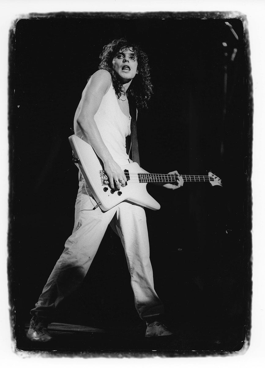 Rick Savage tunes up before another mind-bending Hysteria Tour performance in this rare behind-the-scenes sound check snap. The band really got their steps in at these shows, playing upstairs, downstairs, at all different angles, ensuring that everyone was delivered mad rock 'n roll all around. Rick Allen reminisces about the experience of riding those Hysteria risers up into the air with Sav: "It was pretty unique you know, having four front rows. The scariest part of the show for me was the whole riser during the middle section of Rocket would start to go up into the air. Probably up to about you know, probably about 30 feet above the deck. You know, Sav was standing behind me, looking out. And I'm standing or sitting you know, looking into my kit. So I'm looking one way, he's looking the other. And as the, as the riser went higher and higher and higher, Sav would start to push into me. So it was like at certain times, it got really quite challenging to play, because he was, he was obviously a little afraid of heights, you know? And like I say as we got, as we got further up in the air, he would push further in. And I didn't want to push back on him because you know, I mean it, it would have been disaster, disastrous if he had fallen off." 4x6 color print. Courtesy of the Lorelei Shellist Private Collection.