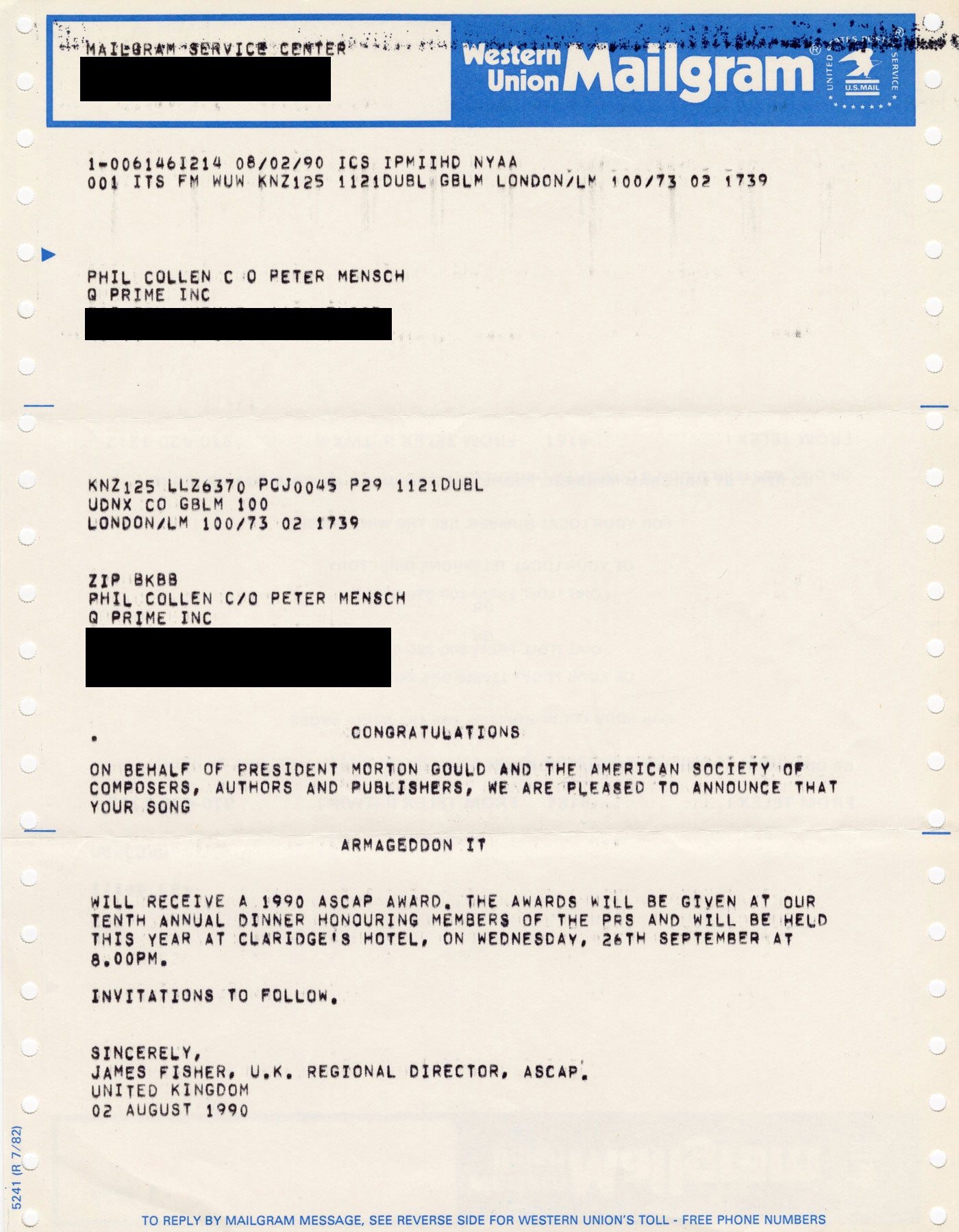 Western Union Mailgram, dated 2 August 1990, congratulating Phil on Hysteria's "Armageddon It" ASCAP award and informing him of the address for the ceremony. From the Collection of Def Leppard.