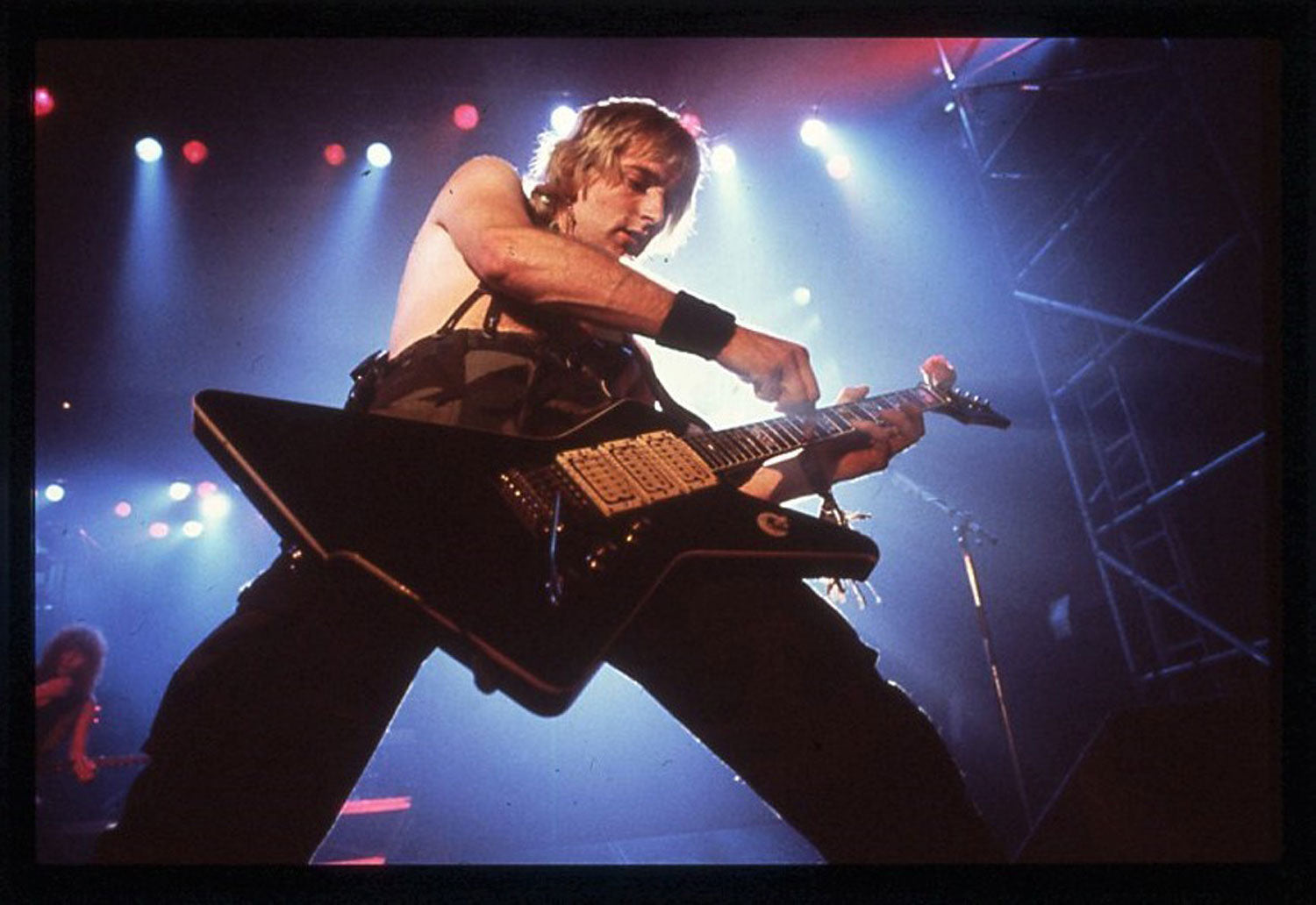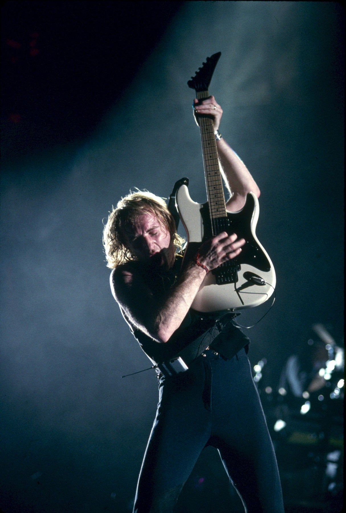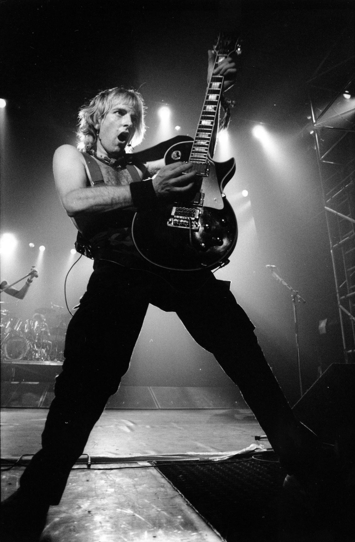 Phil summons powerful riffs on his Gibson Les Paul during the Pyromania Tour, circa 1983. Photo: Ross Halfin. From the Collection of Def Leppard.