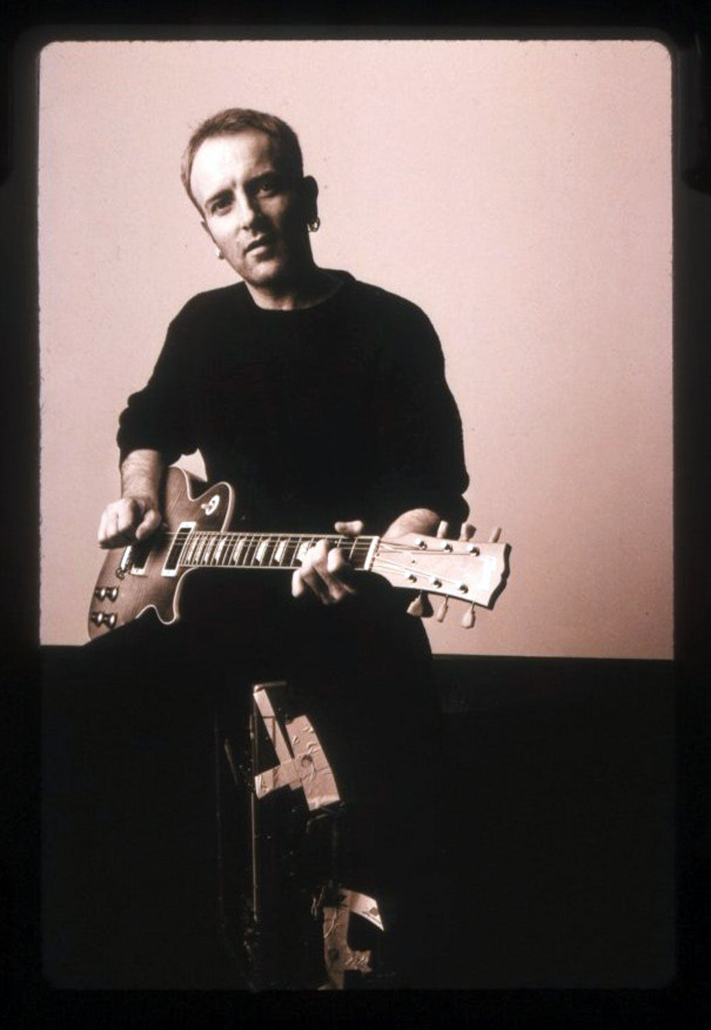 Phil holds the silver version of his Jackson Phil Collen Signature Series PC1 Archtop in the portrait, circa 1992. From the Collection of Def Leppard.