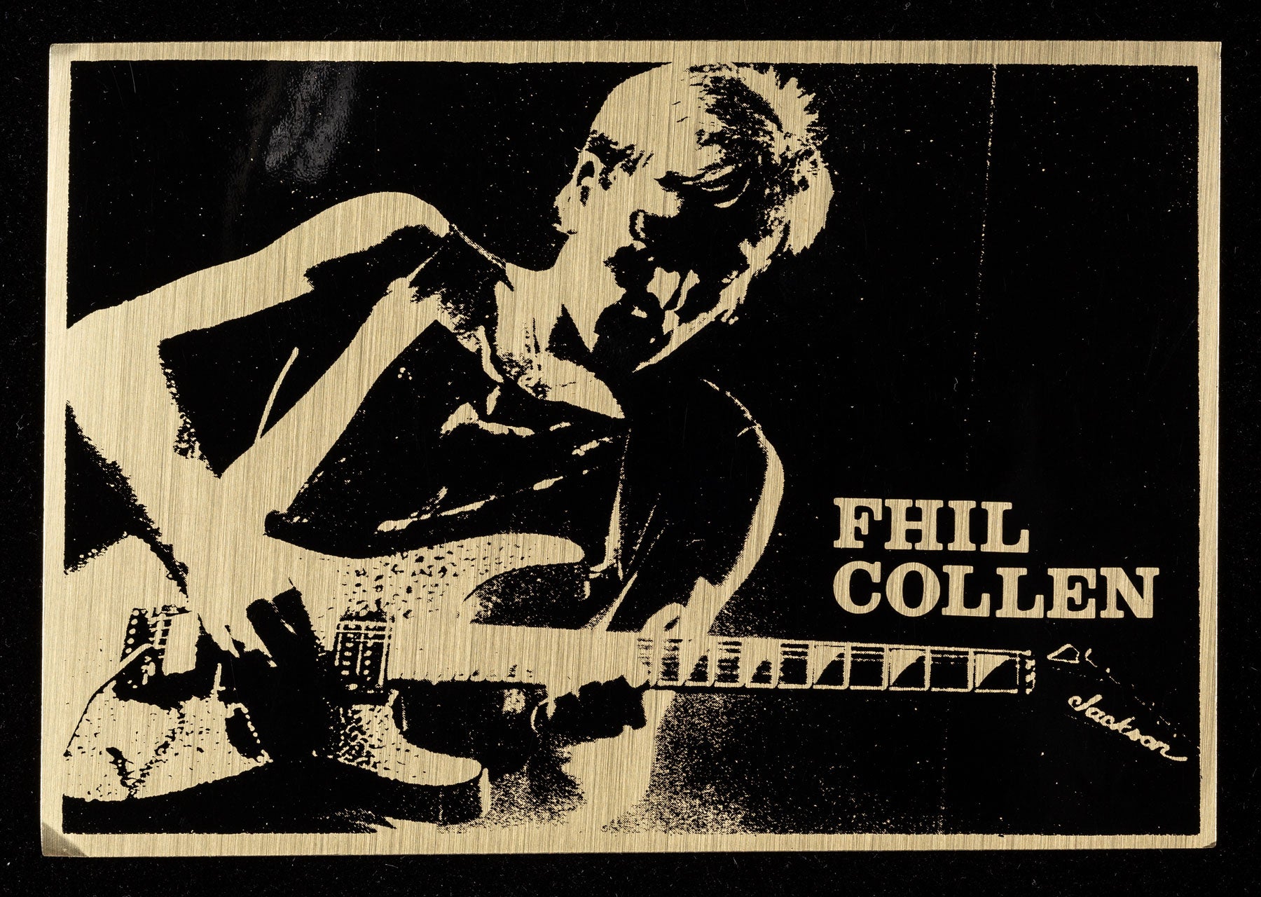 Phil's solo shines through in this fan-designed gold dual-tone metallic sticker, circa 1987. Inventive spelling, no extra charge. From the Collection of Joe Elliott.