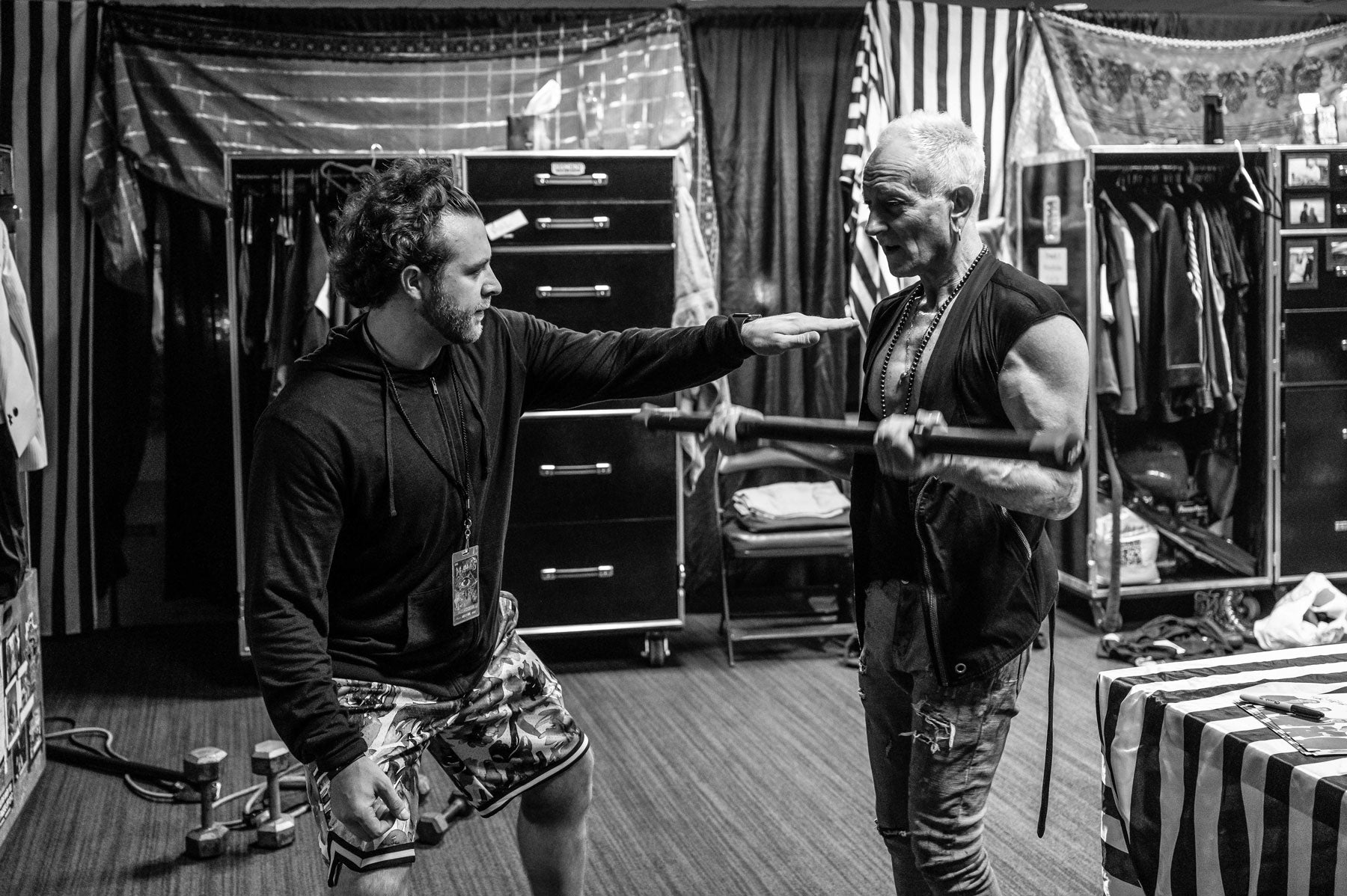 Phil keeps his routine steady and strong with assistance from his trainer. This workout was in a backstage area of Minute Maid Park in Houston, Texas during the 2022 Stadium Tour. Photo: Kevin Nixon. From the Collection of Def Leppard