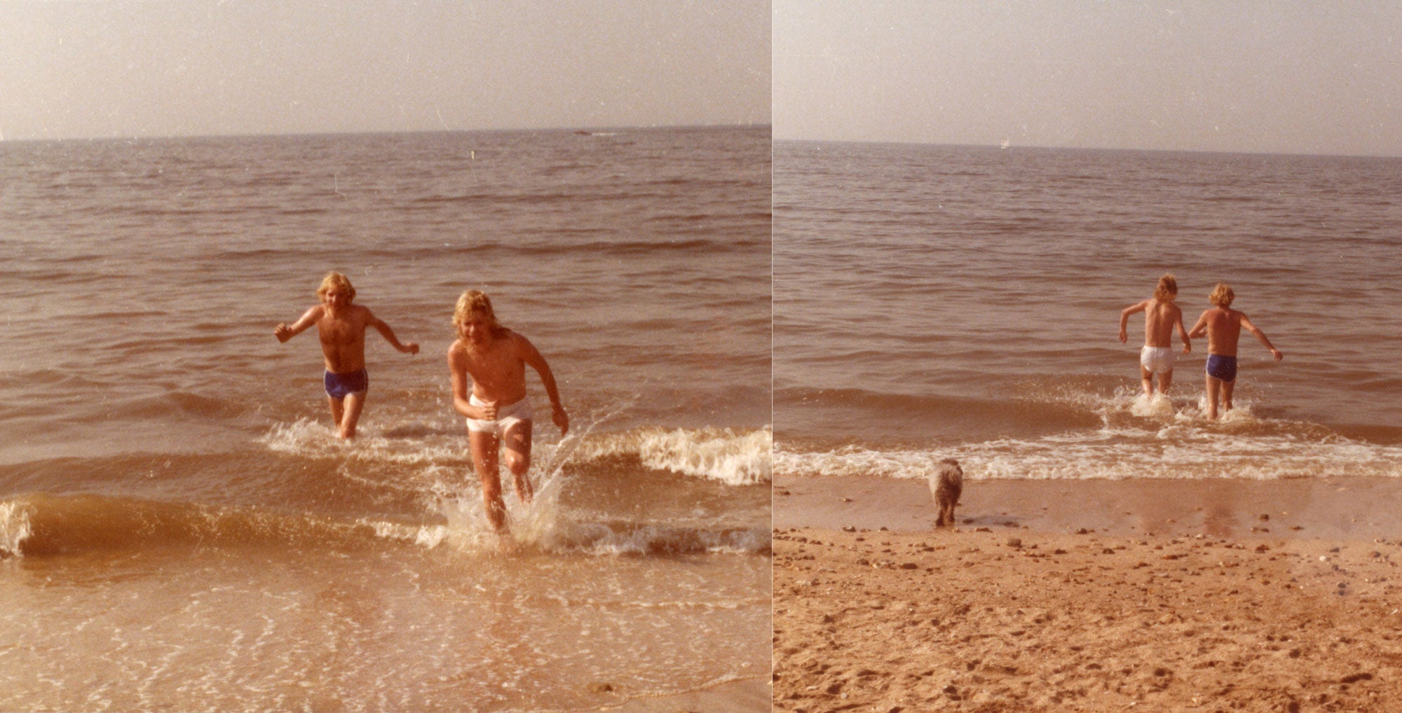 Phil and Steve get out of the water as fast as they got in during a beach excursion in Honfleur-Deauville, France, during the Pyromania Tour. Courtesy of the Lorelei Shellist Private Collection.