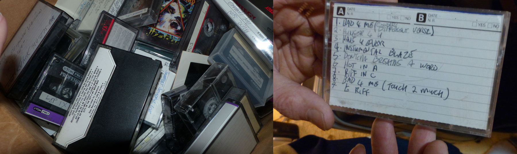 Phil holds an unreleased demo cassette tape that was recorded during the writing of Hysteria. Tracks include riffs and verses, some of which would go on to become songs on the album. From the Collection of Phil Collen.