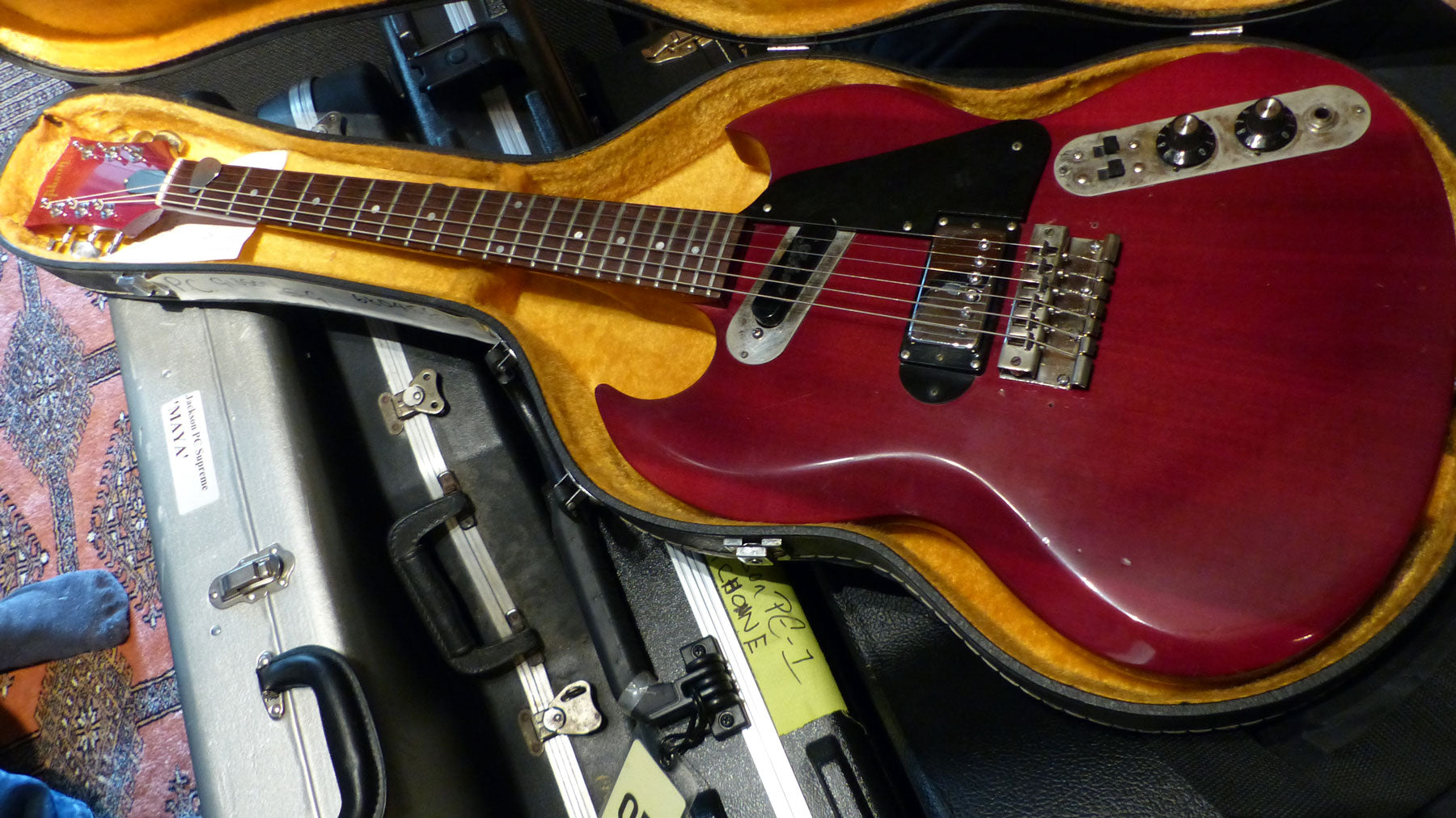 Phil's first guitar, an entry-level 1970s Gibson SG-200. Phil remembers: "It originally came with a strange pickup selector, switching system and two single coil pickups. But after playing it for a while I felt I needed a bit more oomph, so I had the local guitar shop in Walthamstow route out a hole and stick a Gibson humbucker in it. I loved it and couldn’t put it down. It also became obvious as I got a little older what a cool thing it was for my parents to get me this for my sixteenth birthday, as they weren’t exactly loaded." From the Collection of Phil Collen.