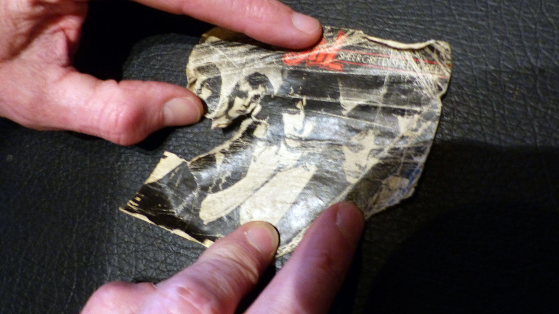 Phil smooths the worn edges of his original Girl sticker in support of the band's debut 1980 album Sheer Greed. The Sheer Greed cover photo used for the sticker was taken by Fin Costello. After playing in the bands Lucy, Tush and Dumb Blondes, Phil was a member of Girl, along with Phil Lewis of L.A. Guns, from 1979 to 1982. From the Collection of Phil Collen.