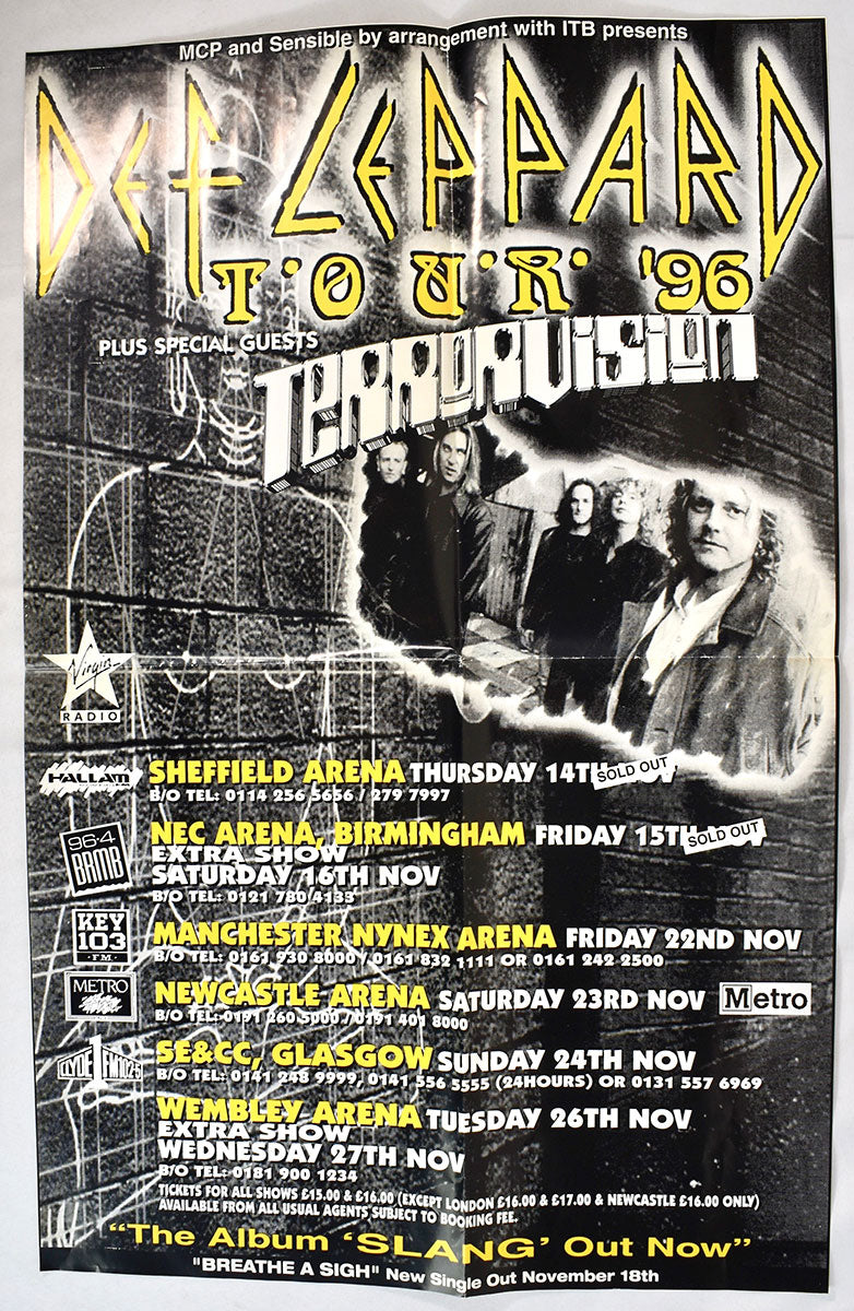 This English poster catches the success of the Slang Tour in November 1996 by featuring shows added at Sheffield Arena, NEC Arena in Birmingham, and Wembley Arena. Special guests for this leg were English rockers Terrorvision. From the Collection of Def Leppard.