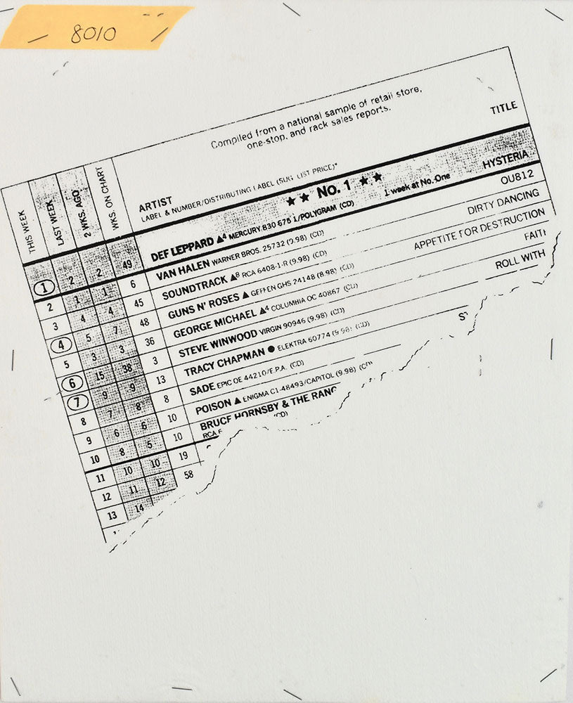 Sample of screened art on white fabric featuring an album chart design. T-shirts printed with this image were produced to celebrate Hysteria conquering the US Billboard charts in July 1988. From the Collection of Def Leppard.