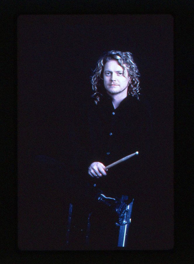 Rick sports all black and is drum-ready in this Slang promotional photo shoot. Photo: Cynthia Levine. From the Collection of Def Leppard.
