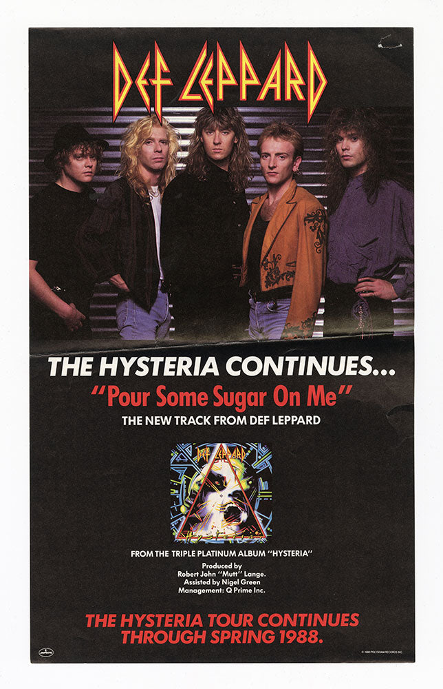 Full-page advert clipped from The Album Network Magazine, 1988, promoting the release of "Pour Some Sugar On Me," and the continuing Hysteria World Tour. From the Collection of Def Leppard.