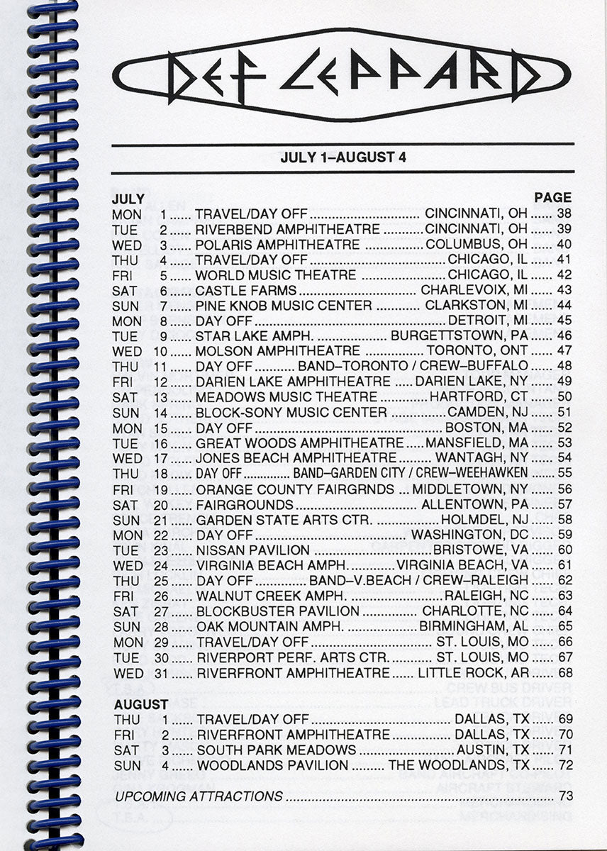 A page from the spiral-bound tour itinerary book that details travel from July to August 1996 for the Slang World Tour, aka the "None More Black" Tour. From the Collection of Def Leppard.