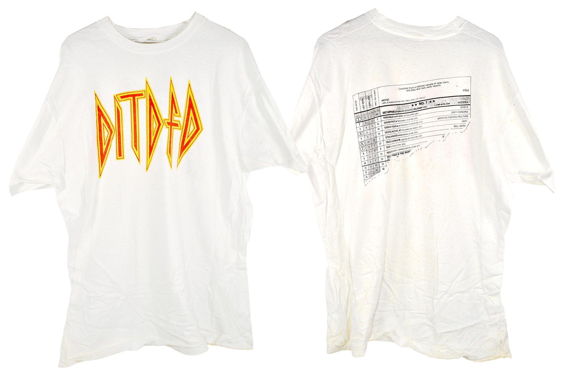 A t-shirt from the mysterious "Word Shirt" series, circa 1988, with the letters "DITDFD" on the front and an image of a US Billboard Top 200 Album Chart (with Hysteria in the top spot) on the back. The acronym "DITDFD" stands for "Dicks In The Dirt For Days". Joe recalls that this printing was likely done because "all the shows in the summer of ‘88 were sold out way in advance - to the point we were doing multiple nights in every city pretty much!" From the Collection of Def Leppard.