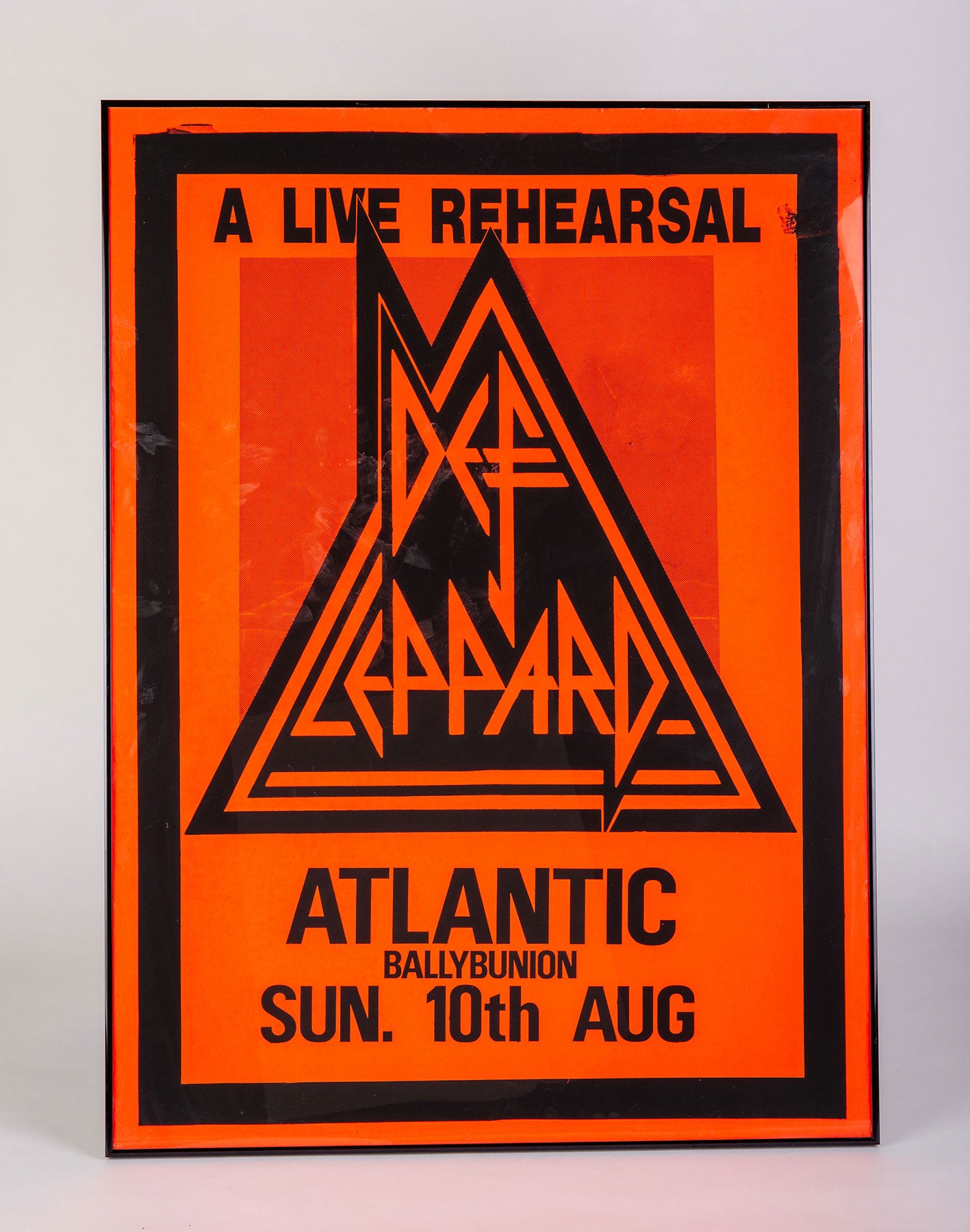 Poster from a live rehearsal, Atlantic Hotel, Ballybunion, Ireland, 10 August 1986. This show was the fourth of five warm-up shows in preparation for Rick's official return to live performances, post-accident. It also marks the last night that Rick would use the back-up assistance of drummer Jeff Rich. Six days later, the band would play Monsters of Rock at Castle Donington to over 60,000 fans. From the Collection of Joe Elliott.