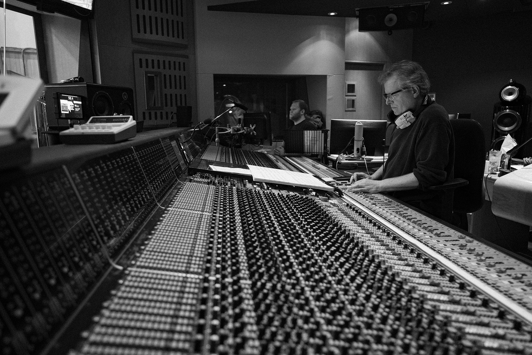 Recording engineer Simon Rhodes sits at Abbey Road's AMS Neve 88RS 60-channel console during a Drastic Symphonies session, March 2022. Photo: Ryan Sebastyan. From the Collection of Def Leppard.