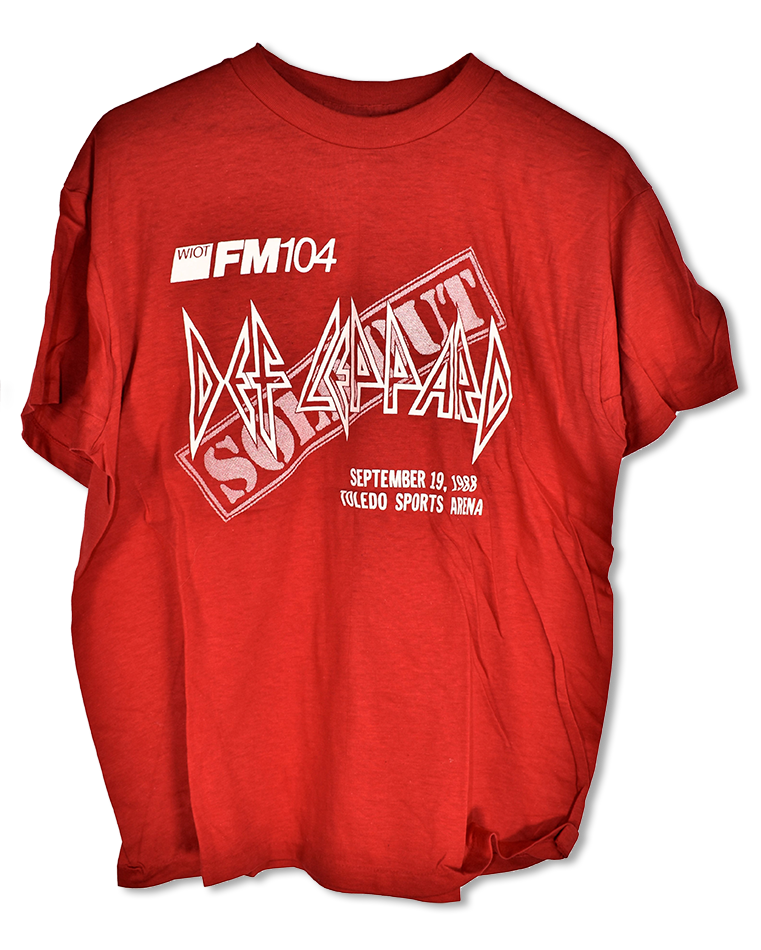 Steve Clark's red WIOT FM104 shirt from the Hysteria Tour show at the Toledo Sports Arena, 19th September, 1988. This Toledo, Ohio stop was not originally planned, until a successful petition campaign started by local radio station WIOT-FM lured the band in. Obviously by the proud declaration of this vintage tee, the show sold out. Well done, WIOT 104. Courtesy of the Lorelei Shellist Private Collection.