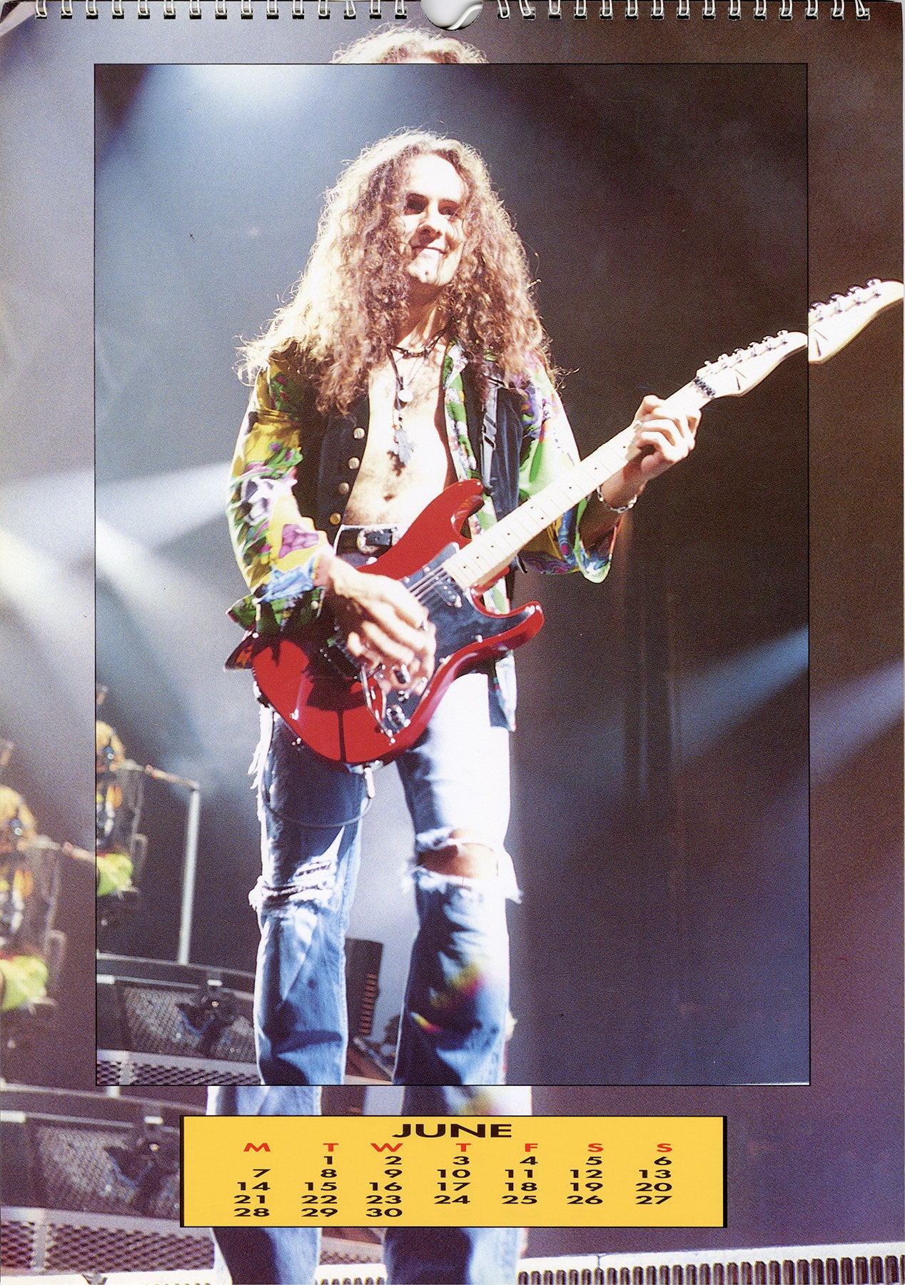 Viv lights up this 1993 calendar mock-up design for June, featuring a live Adrenalize "Seven Day Weekend" Tour photo. From the Collection of Def Leppard.