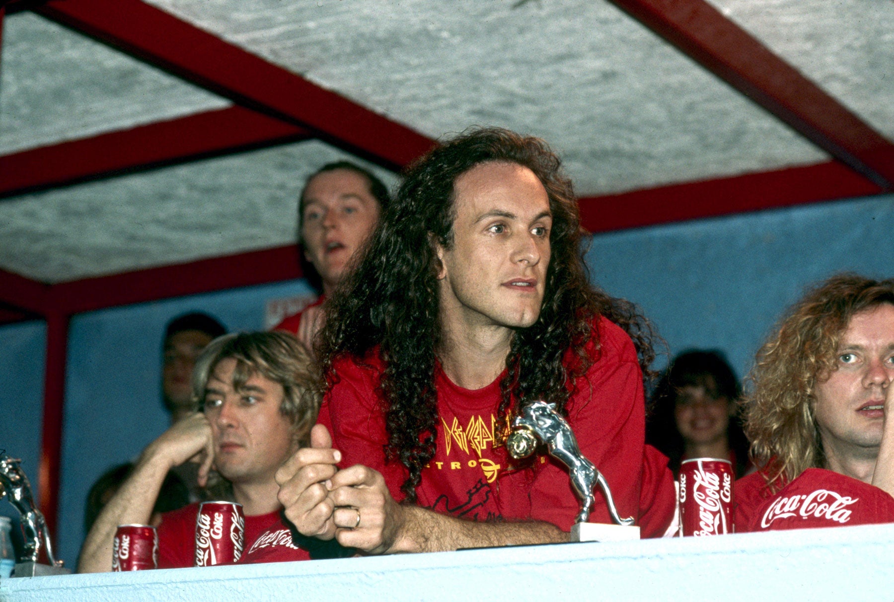 Viv participates in a press conference in support of the band's performance at The Capitol Radio Coca-Cola Music Festival, London, June 1992. Photo: Ross Halfin. From the Collection of Def Leppard.
