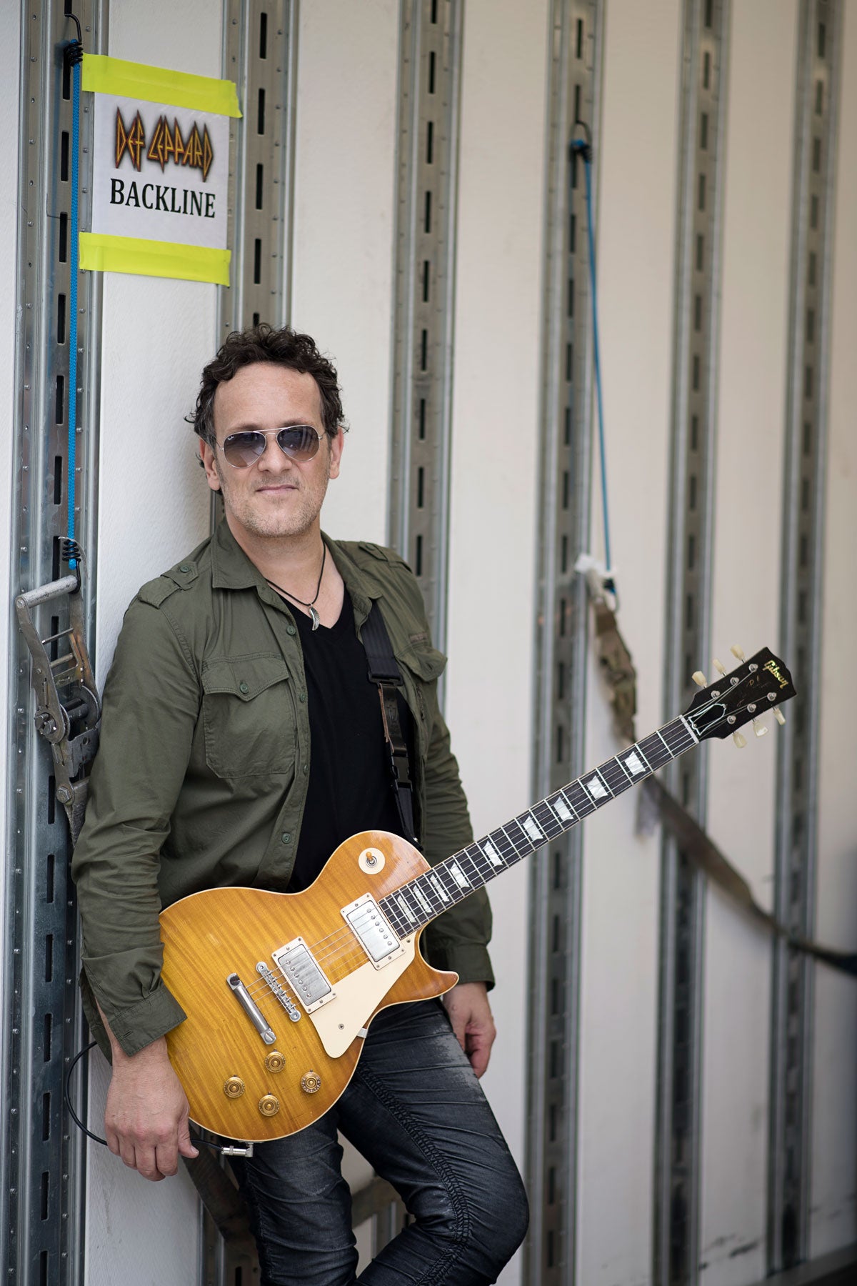Viv lifts his Gibson up for some fancy finger work in Minneapolis during the 2022 Stadium Tour. Photo: Ryan Sebastyan. From the Collection of Def Leppard.