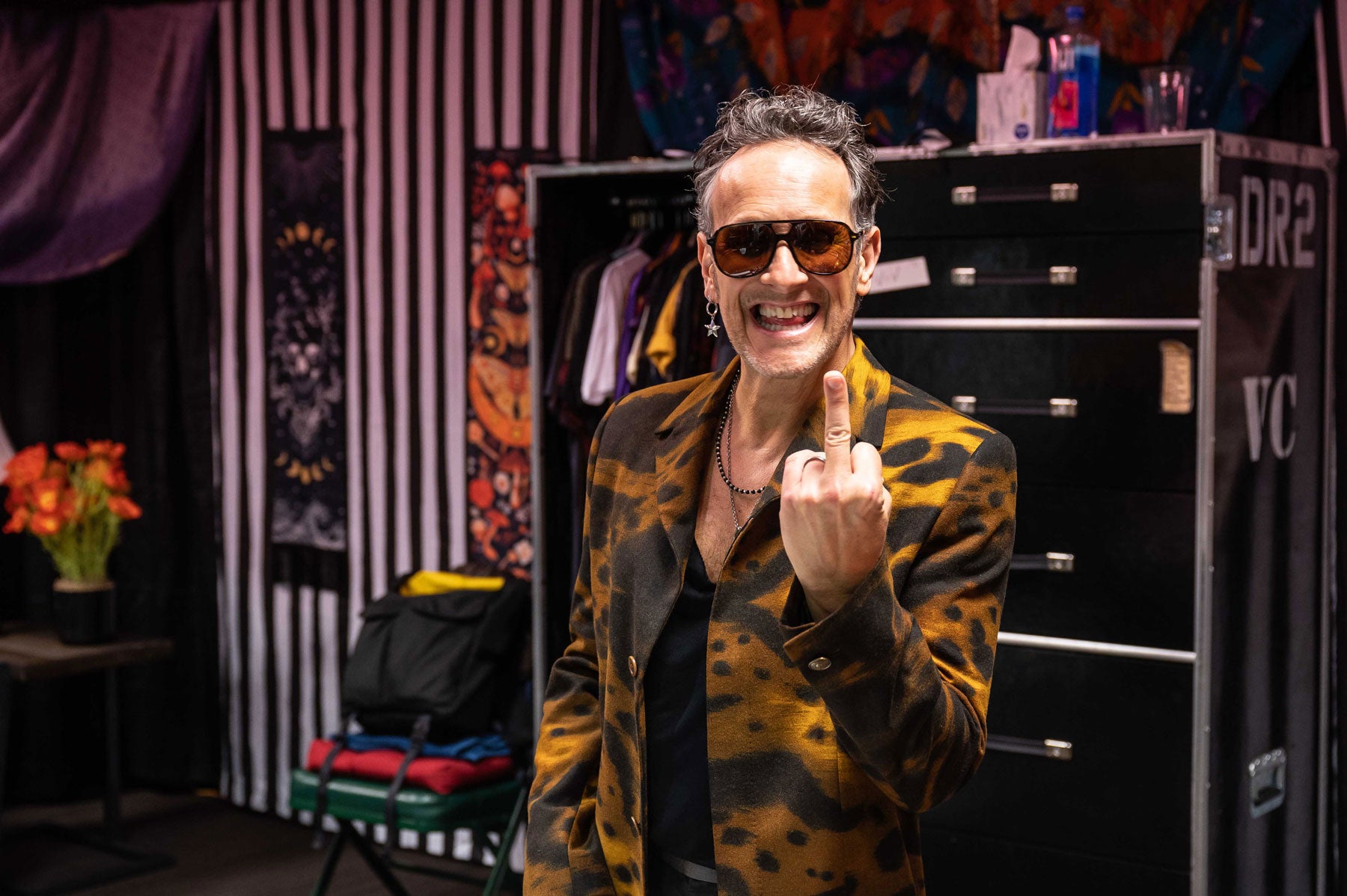 Viv presents us with half a peace sign backstage in Houston on the 2022 Stadium Tour. Photo: Kevin Nixon. From the Collection of Def Leppard.