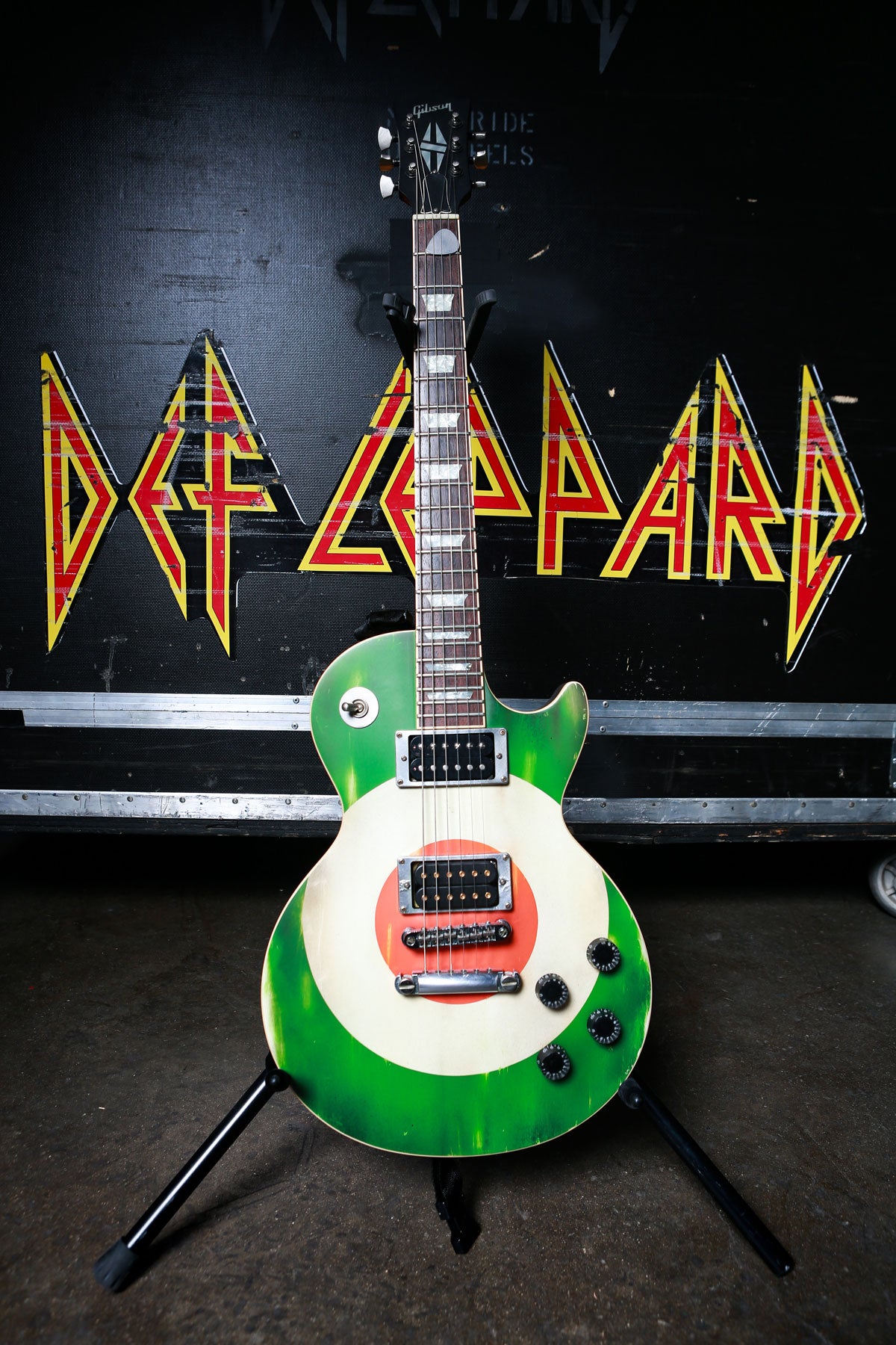 Viv poses with his guitar "Quadrofenian". Put together by GMP Guitars, it boasts the three colours of the Irish flag. Photo: Ross Halfin. From the Collection of Def Leppard.